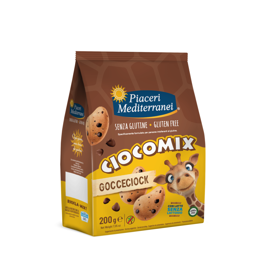 Ingredienti: fecola di patate, farina di mais, zucchero, amido di mais, gocce di cioccolato fondente 13,5% (zucchero, pasta di cacao, burro di cacao, emulsionante: lecitine (soia), aroma naturale di vaniglia – cacao 46% min.), olio di semi di girasole, farina di riso, miele, uova fresche pastorizzate 2%, agenti lievitanti: carbonato acido di ammonio, carbonato acido di sodio; sale, aromi naturali, latte scremato in polvere delattosato 0,14%.