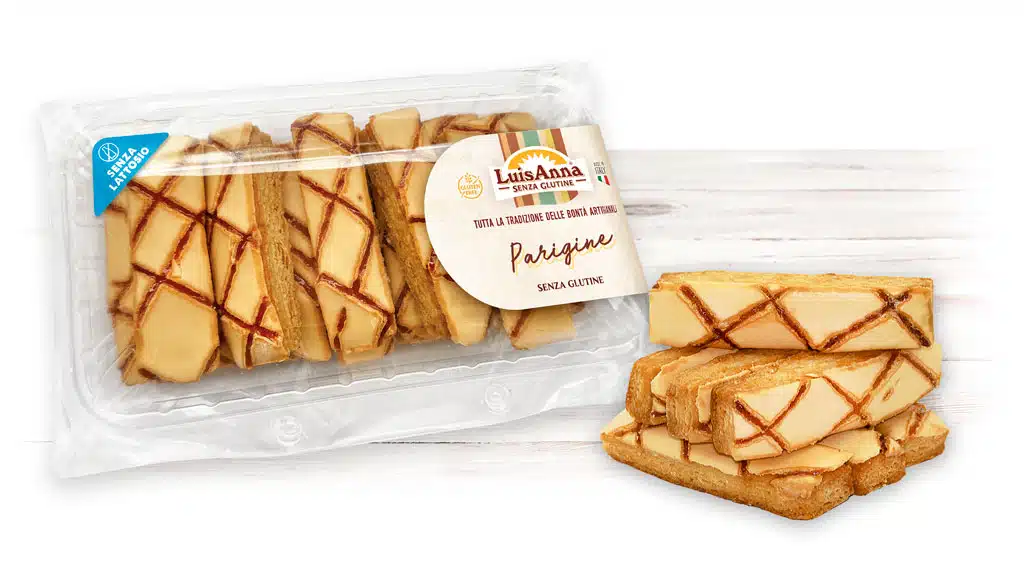 Ingredienti: farina senza glutine (amidi mais e riso), fibre vegetali (bambù, psyllium, inulina), polidestrosio, sale, addensanti: gomma xantan, E464, emulsionante: lecitina di SOIA, enzimi), margarina (oli e grassi vegetali raffinati 80% (palma, colza), acqua, sale, emulsionanti: mono e digliceridi degli acidi grassi (E471), regolatore di acidità: acido citrico (E330), colorante: caroteni (E160a), aroma), acqua, uova pastorizzate, zucchero a velo (saccarosio, amido di mais) albume d’uovo. Decorata in superfice con passata di albicocche (purea di albicocche 50%, zucchero, sciroppo di glucosio, gelificante: pectina).