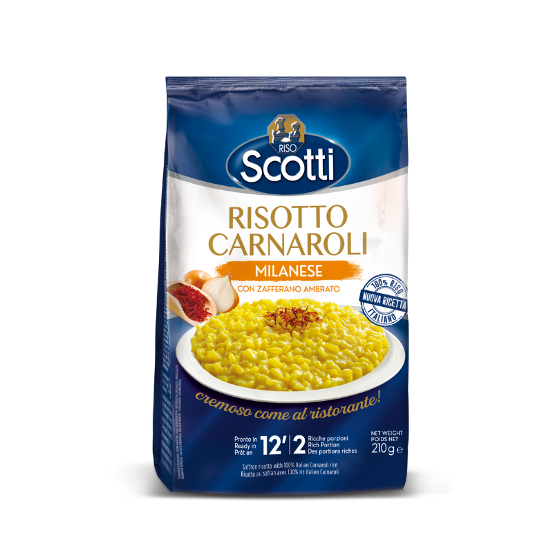 Ingredienti: riso Carnaroli 84,5%, farina di riso, aroma naturale, preparazione a base di formaggio in polvere (siero di latte, formaggio in polvere (latte, sale, caglio, siero di latte), sale, aromi), cipolla 1,4%, preparato a base di olio di oliva in polvere (olio di oliva, sciroppo di glucosio, proteine del latte, aromi naturali), sale marino, latte intero in polvere, zafferano 0,03%, spezie.