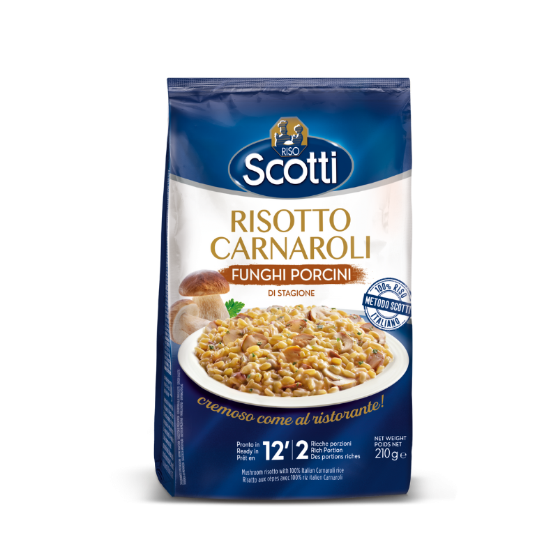Ingredienti: Riso 83,5%, farina di riso, funghi porcini 3% (Boletus edulis e relativo gruppo), preparazione a base di formaggio in polvere (formaggio in polvere, ( latte, sale, caglio, siero di latte) siero di latte, aromi, sale), aromi naturali, sale marino, preparato a base di olio di oliva in polvere (olio di oliva, sciroppo di glucosio, proteine del latte, aromi naturali), latte, intero in polvere, zucchero, cipolla, prezzemolo 0,2%, aglio in polvere.