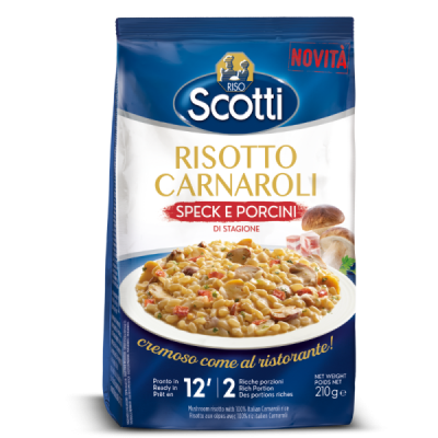 INGREDIENTI: riso Carnaroli 83,5%, farina di riso, preparazione a base di formaggio in polvere (siero di latte, formaggio in polvere (latte, sale, caglio, siero di latte) sale, aromi), aroma naturale, speck disidratato 1,6% (coscia di suino, sale, destrosio, spezie, conservanti: nitrito di sodio, nitrato di sodio), sale marino, funghi porcini 1,2% (Boletus Edulis e relativo gruppo), latte intero in polvere, zucchero, cipolla, aglio, prezzemolo.